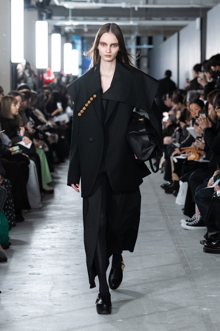 ジャケットの裾や首もとにあしらわれていた白いプリーツも、「彫刻的な雰囲気」を狙っている。