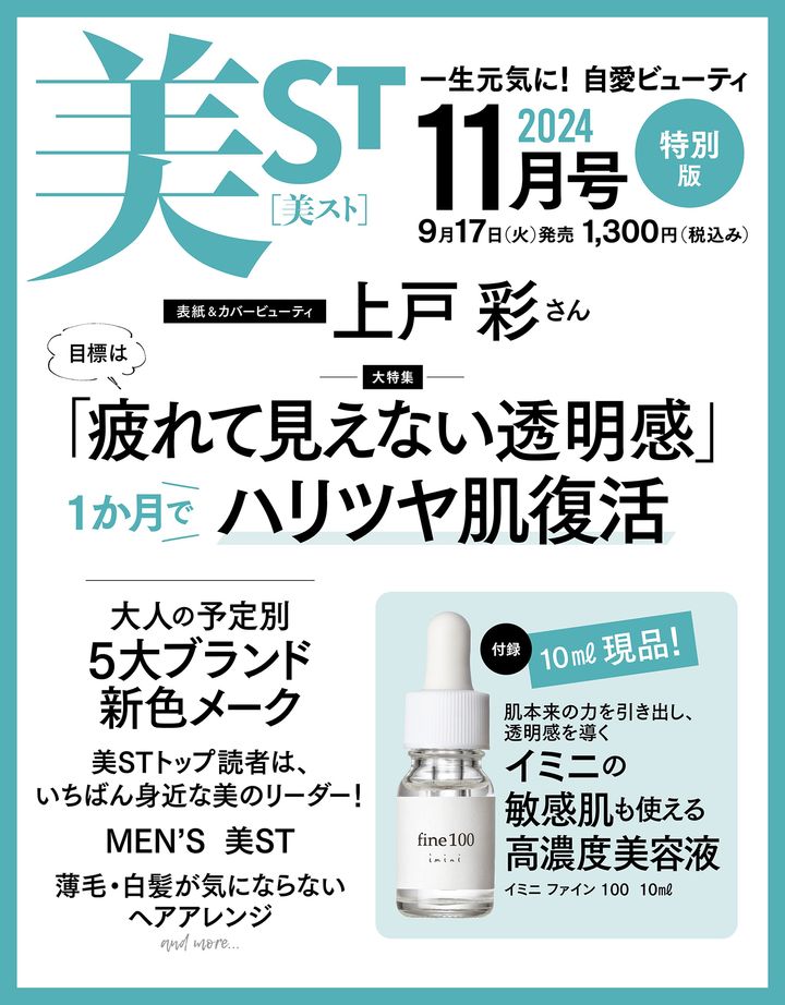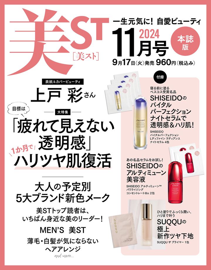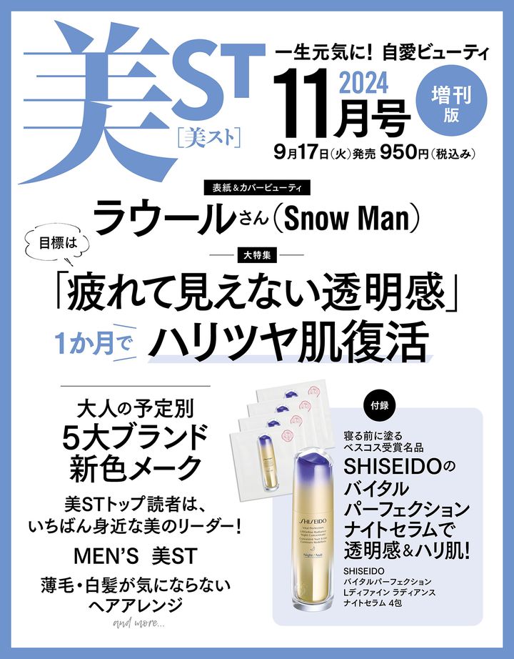 9月17日(火)発売・美ST11月号のネット書店での予約受付が始まりました!上戸彩さん&ラウールさん(Snow Man)が表紙を飾ります!付録は、SHISEIDOのベスコス受賞名品ナイトセラムと美容液、特別版にはイミニのレスキュー美容液が10mlサイズ現品付録となります!完売前にぜひお早めに予約ください!