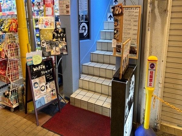 ものすごく目を引くこのお店、実はカフェ&バーなんです。入口にはカフェメニューが記載された看板もありますよ。