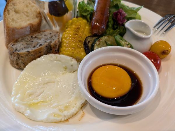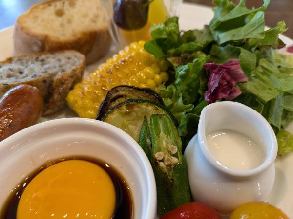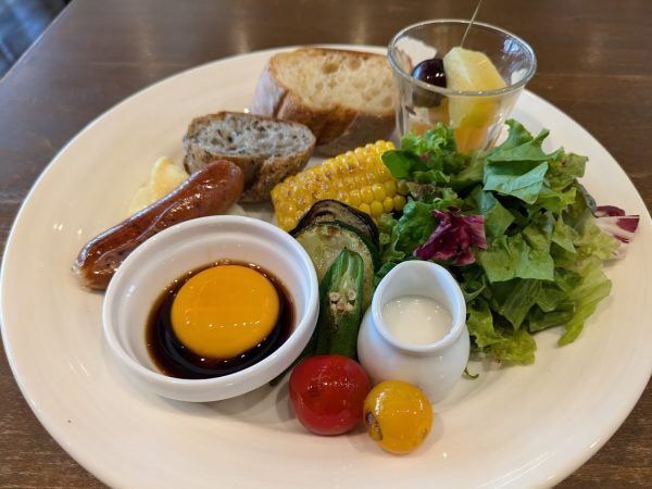 ワンプレートモーニングは、目玉焼き・季節のグリル野菜・ハーブウインナー・サラダ・季節のフルーツ・ハーブバケット2種・ミニドリンク付きです。