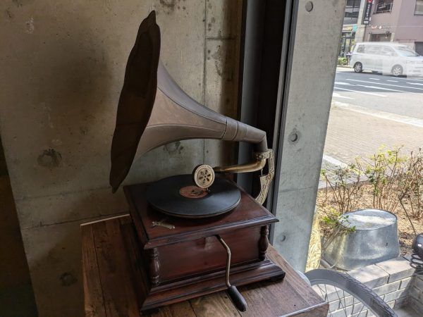 なんてクラッシックなレコードプレイヤー!くるくると手で回すのでしょうか。