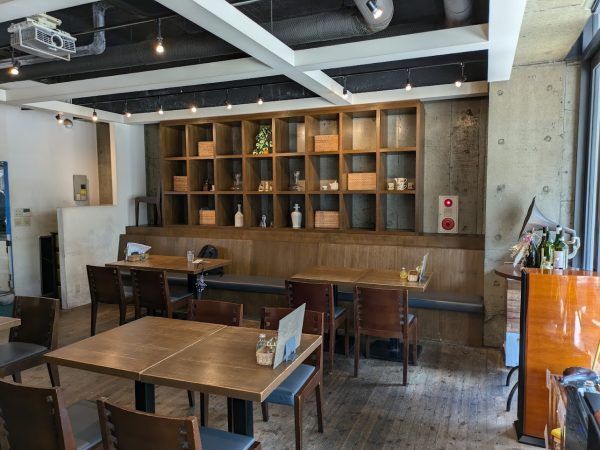 店内は、アンティーク調のインテリアが目を引きます。木の温もりが感じられる上品でお洒落な空間です。ゆったりとしたテーブル席の配置が心地良いです。この棚は見覚えがあります。