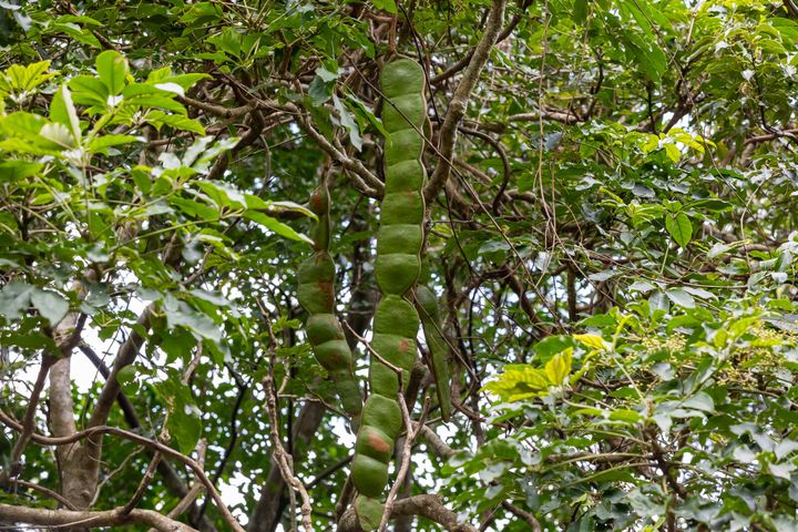 ちなみに、こちらはモダマのサヤ。最長1m、幅10cmにおよぶ巨大なサヤには直径5cmもの丸い種子を含んでいます。