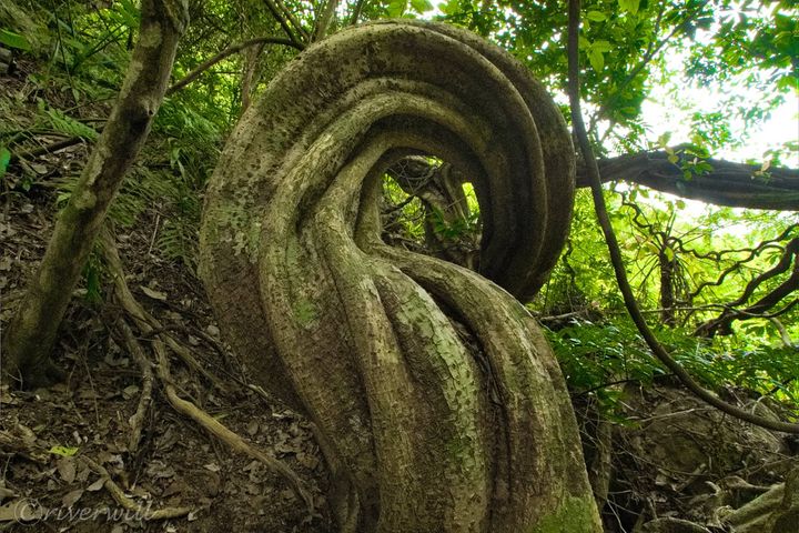 このモダマ、つるが長く太く固く、クルクルねじれて独特の造形美を表すのが特徴で、特にこの人ひとりすっぽり入る巨大な渦巻きモダマは絶好のフォトスポットです。
