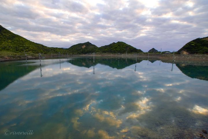 ホノホシ海岸へ向かう道中、たまたま通りがかったため池のリフレクション。雨上がり直後の雲間から朝日が照りはじめ、唯一無二の、またとない絶景に出会えました。