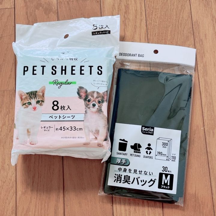 色付き消臭バッグとペットシーツ、あとは新聞紙などのいらない紙で簡易トイレも作れるとネットで紹介されていました!