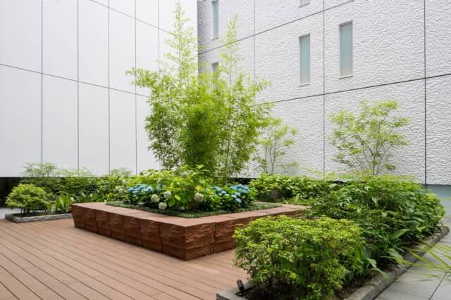 ガーデンの名前の由来にもなっている9階の中庭は、季節にあわせて植物を植え替えています。取材に伺った6月は、笹とアジサイが目を楽しませてくれました。秋は紅葉する樹々に替えるなど、都会の真ん中で四季の移ろいに触れられます。