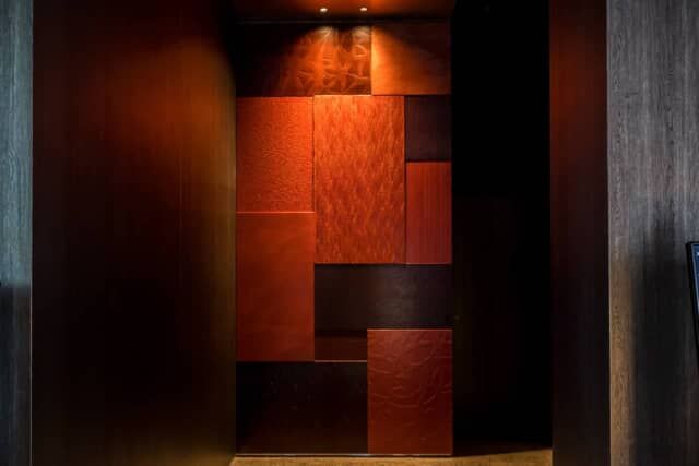 抑えた色調で構成されたホテル内で、目に飛び込む鮮やかな紅色。近づいて見ると、テクスチャーの異なるパネルが、日本の伝統工芸品を思わせる彩りを発していました。
