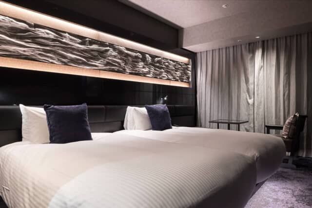 客室はダブル、ツイン、トリプルが用意され、ジュニアスイートツインを含めた7タイプ、264室です。全ての客室は黒を基調にしたシックで落ち着いた雰囲気。ライティングデスクはあえて置かず、ソファーや椅子、テーブルを並べることで、くつろいだ空間になっています。