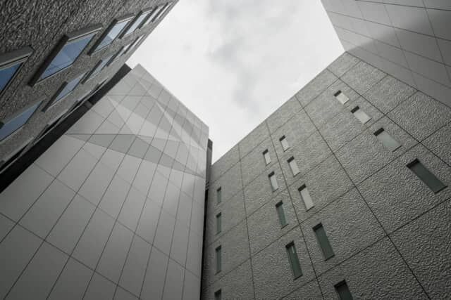 中庭を囲む壁面は、潰した和紙を広げたシワを表現。三角に折り曲げられた壁の上部は、外光を反射して庭に効率よく光を取り込む効果があるのだとか。