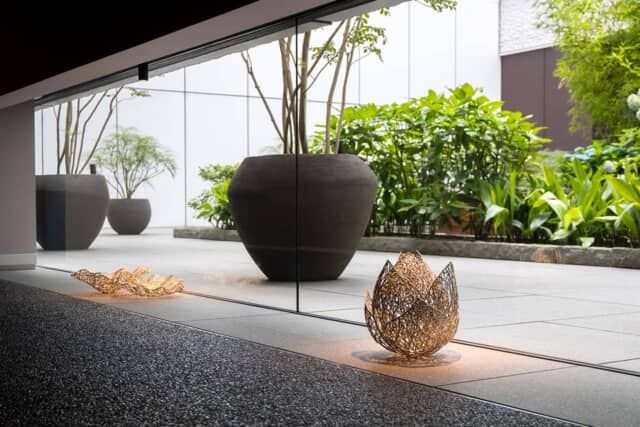 水のテーマが、花のアートにも現れます。水面から咲く蓮の花は錫で作られ、大浴場に向かう通路の地窓を飾ります。花の形がひとつひとつ異なっているのは、刻々と変化する花の姿を表現。光のあて方や影の出来方もこだわった作品です。