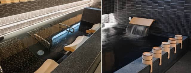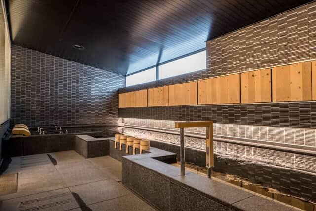 大浴場は男女とも似た造りになっていて、落ち着いた色調のタイルがはめ込まれ、切妻天井を採用するなど、日本家屋の要素も採り入れます。壁を飾る木材は、関西で風呂桶などに重用される高級木材の高野槙(こうやまき)で、関東では珍しい素材です。