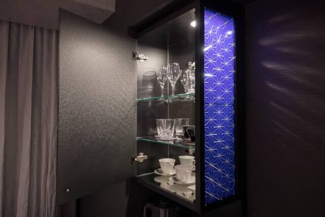 ワイングラスやコーヒーカップ、アイスペールなどを用意。モノトーンの客室にあって、唯一の色彩となるのが、麻の葉模様が描かれた江戸切子風のサイドパネル。ツインの客室が紫色、クイーンとダブルはオレンジになっています。