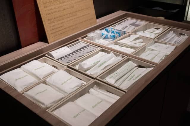 ここで必要なアメニティをピックアップ。大浴場に向かう動線にあるのも便利です。