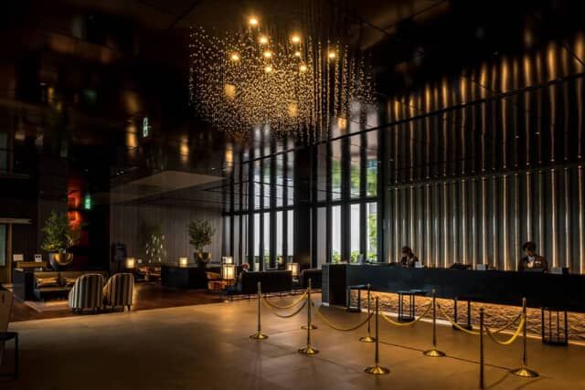 ゆったりとしたソファーやテーブルが置かれたロビーラウンジ。スタイリッシュな空間の中に、日本伝統の麻の葉模様をモチーフにした、江戸切子を思わせる照明が灯されています。