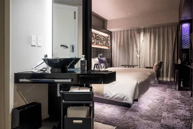 スーペリアツインは大通りに面した客室です。アイランドタイプの洗面があって、信楽焼の洗面ボウルにさり気ない和を感じます。ベッドルームと水回りの間にスライドドアがあるので、バスルームや洗面の利用時にプライバシーを守ることもできます。