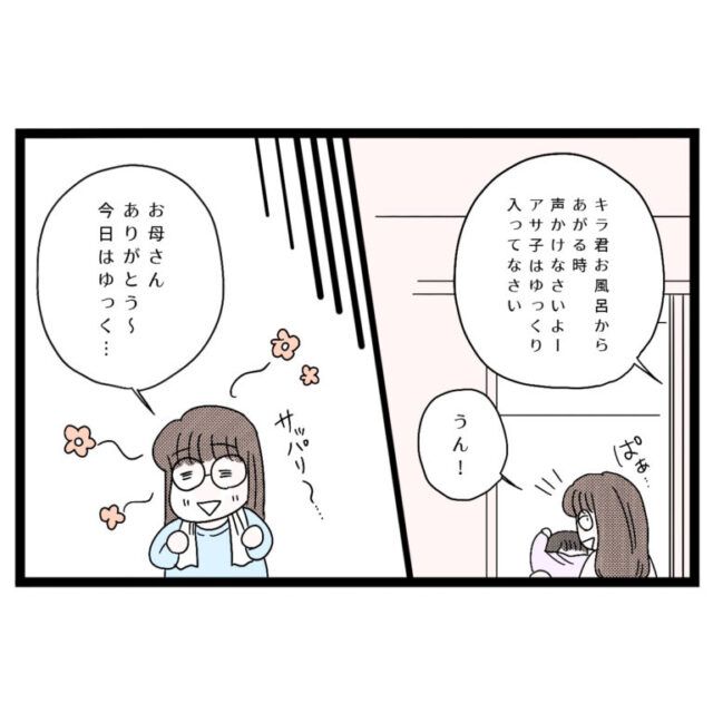 「キラくんお風呂から上がる時声かけなさいよーアサ子はゆっくり入ってなさい」とお母さんが言ってくれ、久しぶりにゆっくりお風呂に入れるとアサ子さんはとても嬉しい気持ちになりました。