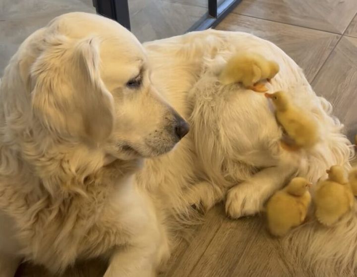犬の体がすべり台に! 楽しそうに遊ぶアヒルちゃんたち。