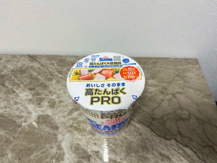 カップヌードルPROはスタンダードな味はもちろん、チリトマト味やカレー味があるので、飽きることがありません!今回の写真は私の1番好きな味、シーフードです!