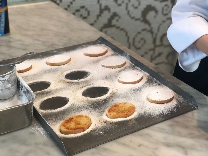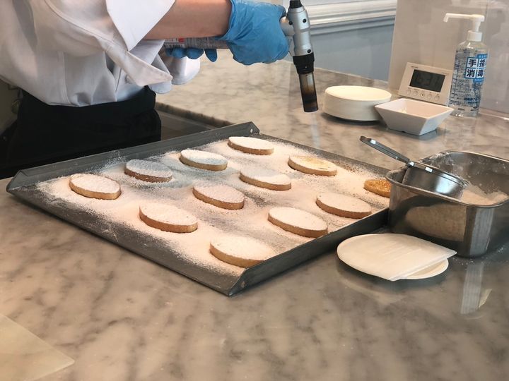 たっぷりと粉砂糖がかけられたフランスパンが勢いよくバーナーで炙られて完成する「グーテ・デ・ロワ ブリュレ」は、ガトーフェスタ ハラダの工場見学でのみいただくことができる限定試食なんです。