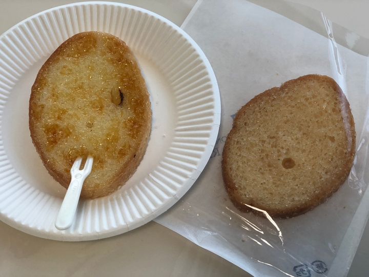 全体的に少し遠くて見づらいのと、ラスクが焼きあがる瞬間は見ることができないのですが、通路から近い場所では次々と包装され流れていく様子が楽しめます。