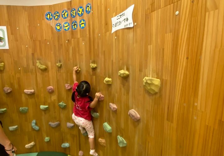 ここには小さい子どもでも楽しめる低いクライミングウォールがあります。娘はいつか「がんばるウォール」デビューする時のためにここで鍛えています。