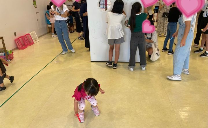 決められたエリア内の壁や床に水性ペンでお絵描きができる「ホワイトあとりえ」へ。