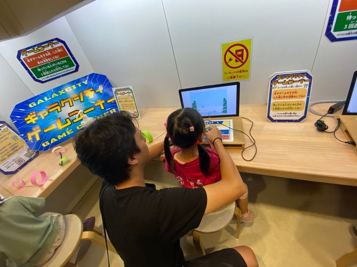 デジタルきゃんばすの横にはパソコンが数台置かれていてファミコンのコントローラーを使ってゲームができます。プログラミングを学ぶ中高生が作ったオリジナルゲームとのこと。ここでしか遊べない特別感があります。