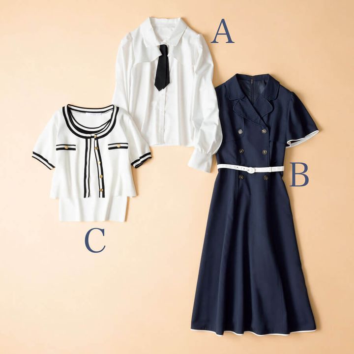 オフィスの必需品、ニットアンサンブルをライン切り替えで旬顔にバージョンアップ。