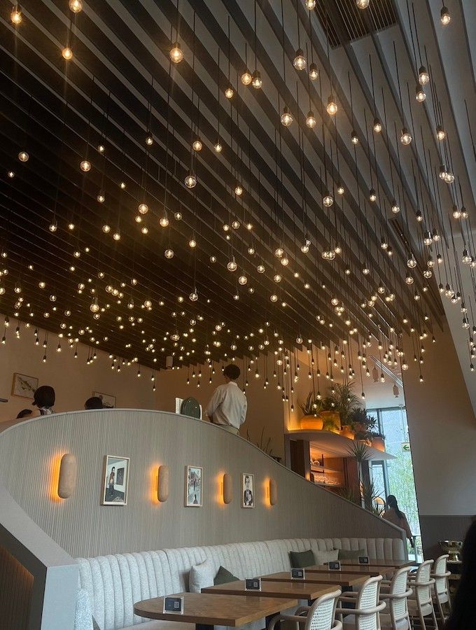 昼は明るく開放的でランチやカフェが利用できます。小さなペンダントライトが灯り、お昼はオシャレなリゾート気分が味わえ、夜は星空の中にいるような空間に♡ 店内はとてもお洒落できれいな空間で、ソファー席やバーカウンターも。渋谷での女子会におすすめです♡