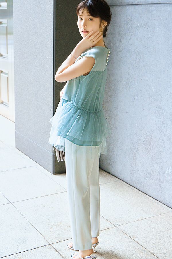 大人可愛いデザインのミントカラーのチュールトップスも、ホワイトパンツ合わせでエレガントな佇まいに。バックネックのパールで後ろ姿まで美しく。