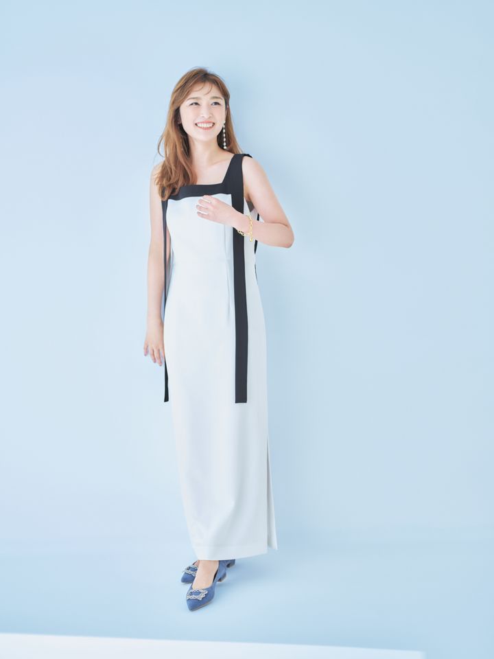 ワンピース¥25,300(ジャスグリッティー)パンプス¥16,500(ダイアナ/ダイアナ 銀座本店)ピアス¥47,300〈Pearl for Life〉ブレスレット¥12,650〈ripsalis〉(ともにロードス)