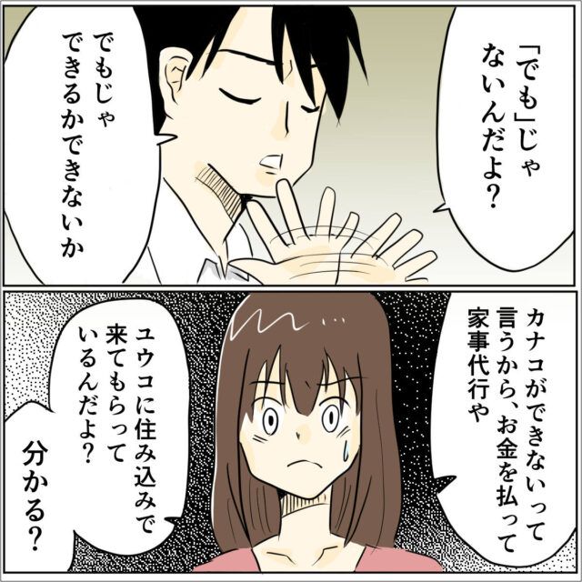 「でもじゃないんだよ、でもじゃ。できるかできないか。カナコができないって言うから、お金を払って家事代行やユウコに住み込みで来てもらってるんだよ?わかる?」全ての原因が私にある、私のせいだと言われている気持ちになりました。