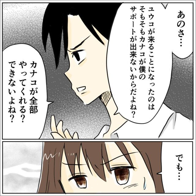 ところが夫は私を責めるように言いました。「あのさ・・・ユウコが来ることになったのはそもそもカナコが僕のサポートができないからだよね?カナコが全部やってくれる?できないよね?」「でも・・・」できないのが前提の言い方。くやしいような、悲しいような気持になりました。