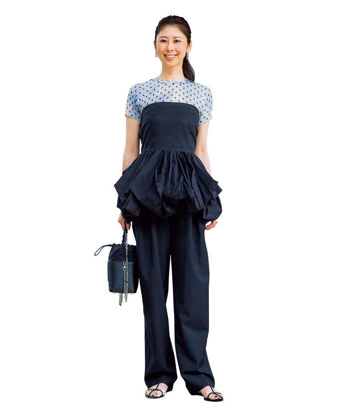 『チュール、透け感、ドットの、女子力が高すぎるトップスにやられました。マニッシュなワイドパンツが全体バランスの調整役に。』