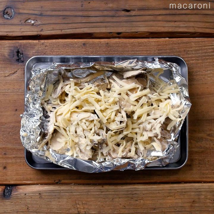 2: アルミホイルの上に①をのせ、とろけるチーズをかけます。