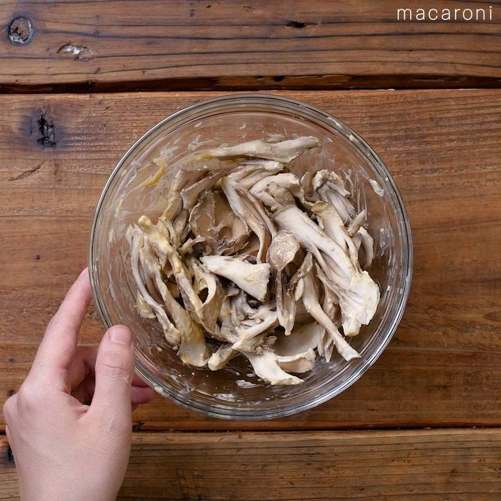 1: ボウルに【調味料】を入れてよく混ぜ、まいたけをさいて加えて混ぜ合わせます。
