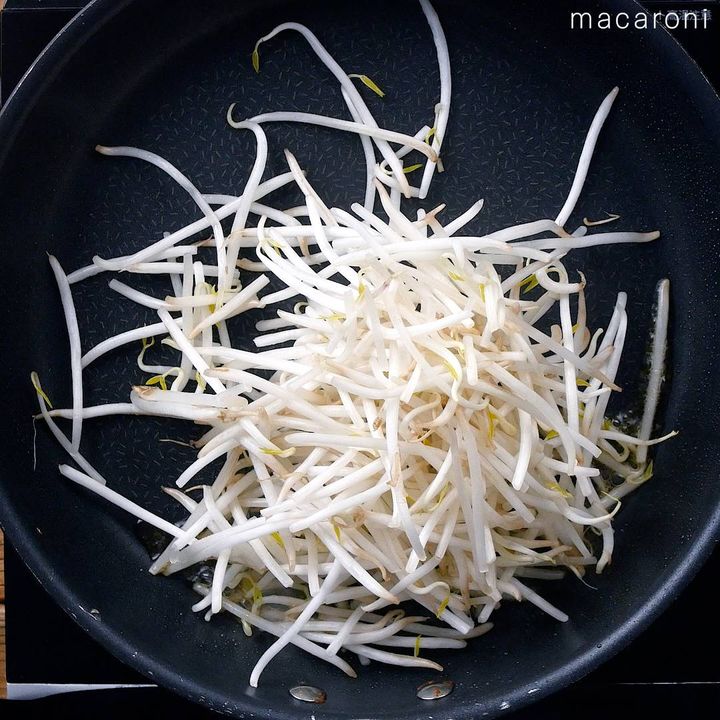 3: 同じフライパンにごま油(大さじ1杯)を入れて強めの中火で熱します。もやし、味付塩こしょうを加えて1分ほど炒めます。