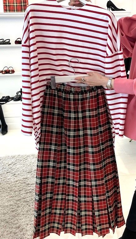 ゆったりとした腰回りと、もたつきのない袖のシルエット。体型カバーを叶えてくれるのがこちらのボーダートップス。スカートは、多めのプリーツでモダンな雰囲気と可愛さを両立しています。一見「ボーダー×チェック」はハードルが高そうに感じますが、それぞれの計算されたシルエットによって案外カジュアルに着こなせます。柄×柄コーデにトライするならこの赤コーデでぜひ!