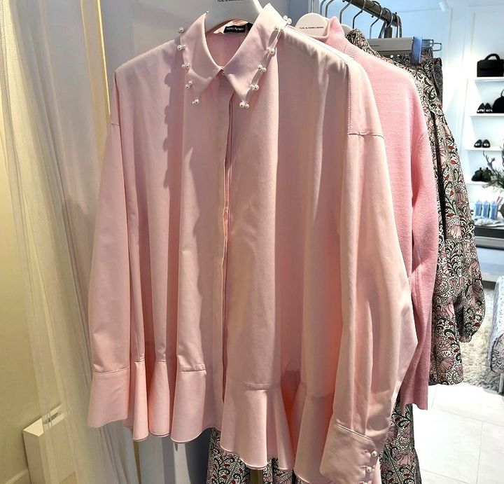 きれいな薄ピンクが目を引く、軽やかで涼し気な1枚。襟のパールと控えめにあしらわれたな裾のフレアなシルエットが、女性らしさを演出してくれます。シャツ型+裾フリルで、程よく華やかに。チュールを合わせて甘めにキメても良し、デニムでカジュアルに整えても良し…組み合わせ自由自在のブラウスで大人可愛いコーデを楽んで。