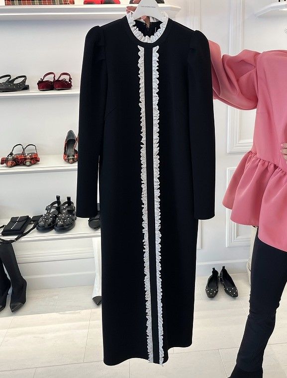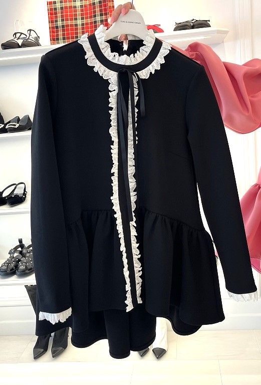 襟元とセンターラインのフリルレースが印象的なこちらの2点。一見似たデザインですが、全く異なった印象ののアイテム。シルエットへのこだわりも特長の一つであるのTSURU by Mariko Oikawaだからこそ楽しめるファッションです。