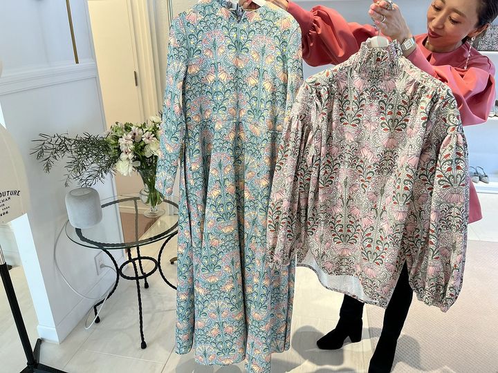 左はサラっとしたスカートが風になびくエレガントな雰囲気のワンピース。爽やかなグリーンに柔らかなお花の色味で、絶妙な美しさを実現しています。上の方と下の方でお花の大きさが異なることによって、知らぬ間にスタイルアップを叶えてくれる優れもの。一方のトップスは、華やかながらも自然と馴染む柔らかなピンクのお花があしらわれた大人シックな印象。ふんわりとしたラインに肩と襟元のギャザーが全体のメリハリラインをコントロールします。1枚で上品に着こなしても、レイヤードでさりげなく柄を見せても◎ロングシーズンで活躍しそうなアイテムです。