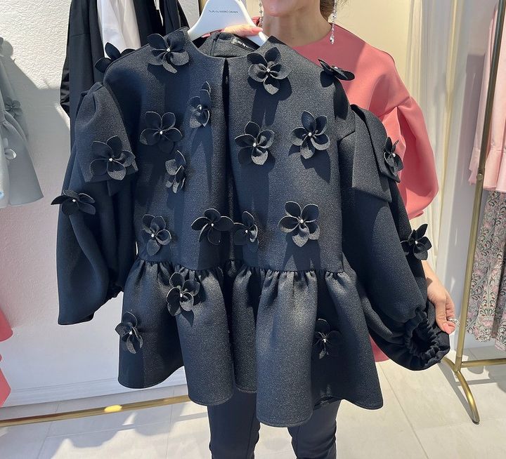 大きなフリルにぽわんとした袖。さらに、全体に散りばめられたガーリーなお花が目を引くこちら。フェミニン度高めのピンクなら、トップスが主役のお出かけコーデに。黒をチョイスして、アンニュイな雰囲気のオールブラックコーデに。どのカラーを選んでも気分をアゲてくれること間違いなしのアイテムです。甘さが気になるときは、デニムを合わせて調節してみるのも◎。さらに、ペプラム部分の絶妙な広がり具合が体形補正と立体感のある印象的なスタイルに。アクセサリー次第でもまた異なる印象を楽しめそう。