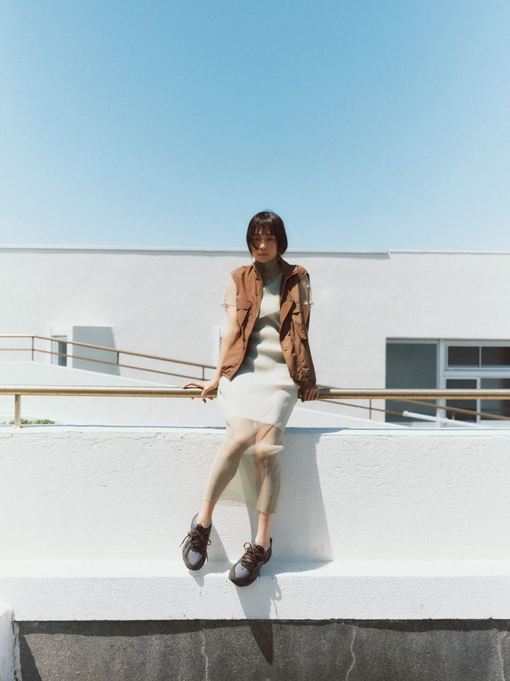 ベスト¥23,100(マーモットキャピタル/エンケル)、ドレス¥40,700(コトハヨコザワ/オン・トーキョーショールーム)、スニーカー¥17,600(アシックス/アシックスジャパン カスタマーサポート部)