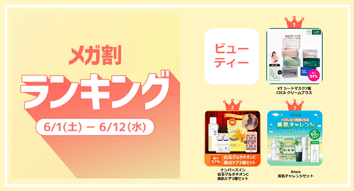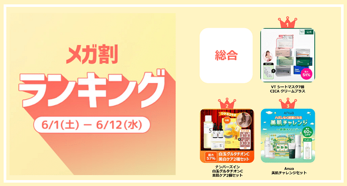 2024年6月時のメガ割では、総合でVTコスメティックスのシートマスクが1位を飾りました。2位にはナンバーズインの美肌ケアセットがランクイン。3位は、アヌアの美肌チャレンジセットという結果になりました。
