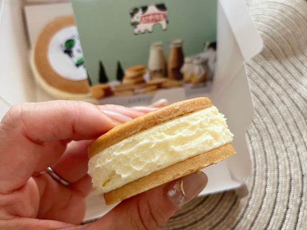 「あさぎり牛乳」と、マスカルポーネチーズ、生クリームで作った特製ミルククリームをたっぷりさっくり食感のバターサブレでサンドしました。 一口食べると、口の中に広がるミルク感!! リッチで、贅沢なスイーツでした。