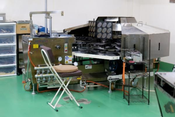 この写真の機械に座り、記事を流し込んで、焼いて… 焼けた煎餅に、一枚一枚、焼き印を手押しするそう。