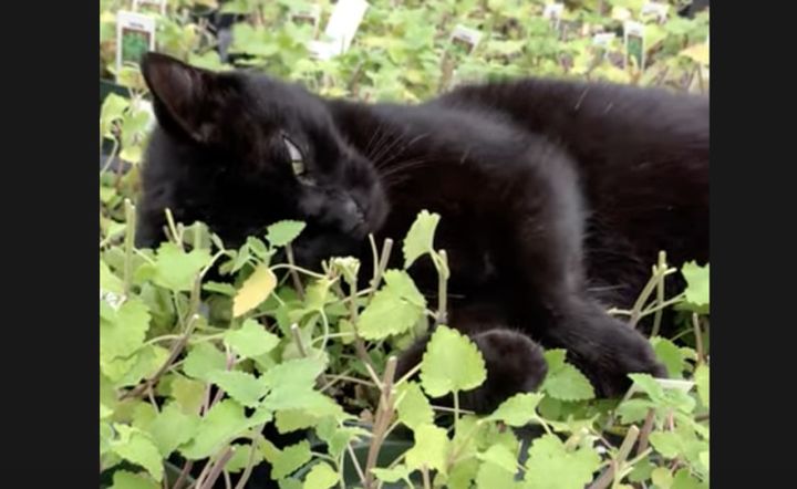 こりゃたまらんニャ。西洋またたびの畑で日光浴する猫。
