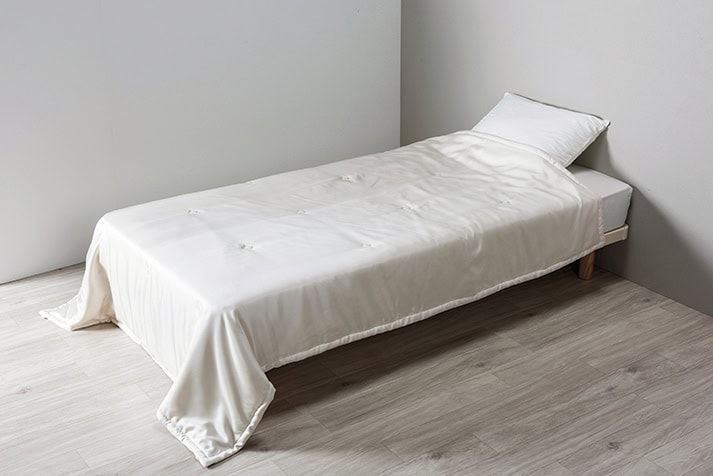 夏でも何も掛けないで寝るのはNG。冷房を上手に使い、快適な温度・湿度を保ちつつ、睡眠中に冷え過ぎてしまいがちなお腹周りはしっかり防寒するのが快眠のカギです。最近では接触冷感素材を使用したものなどさまざまな夏用の掛け布団が登場しているので、好みのものが見つかるはず。布団側はもちろん、中綿までシルク素材の軽量な掛け布団は、夏は涼しく冬は暖かく通年にわたって使用できるので特にオススメです。