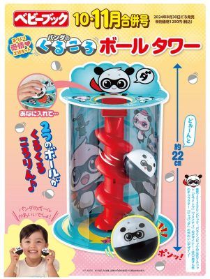 小学館の1・2・3歳向け知育雑誌『ベビーブック』10・11月合併号の付録は、かんたん工作キットで手作りする『パンダの くるころボールタワー』! ボールが柱をつたってくるくると落ちてくる楽しいおもちゃです。